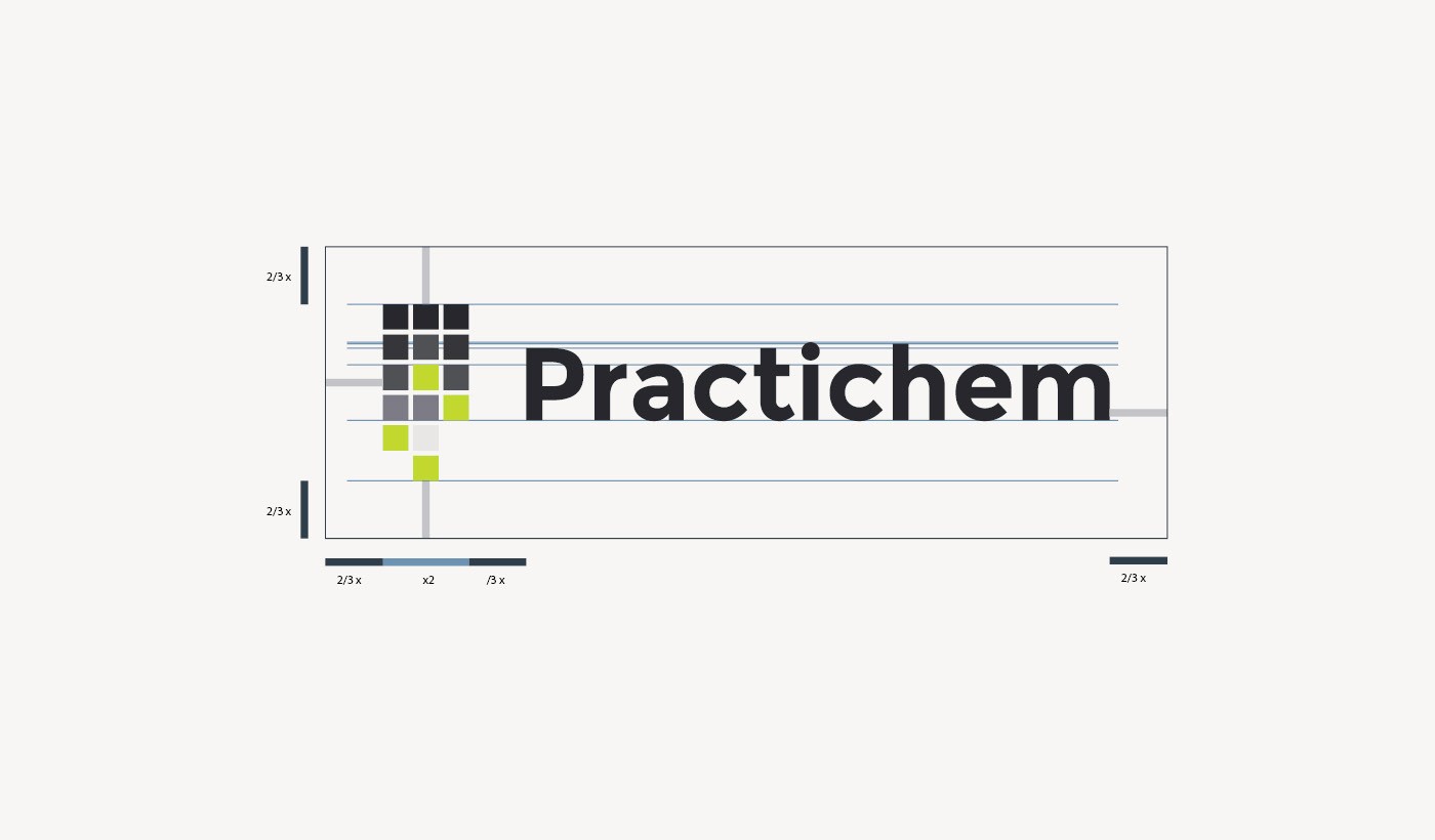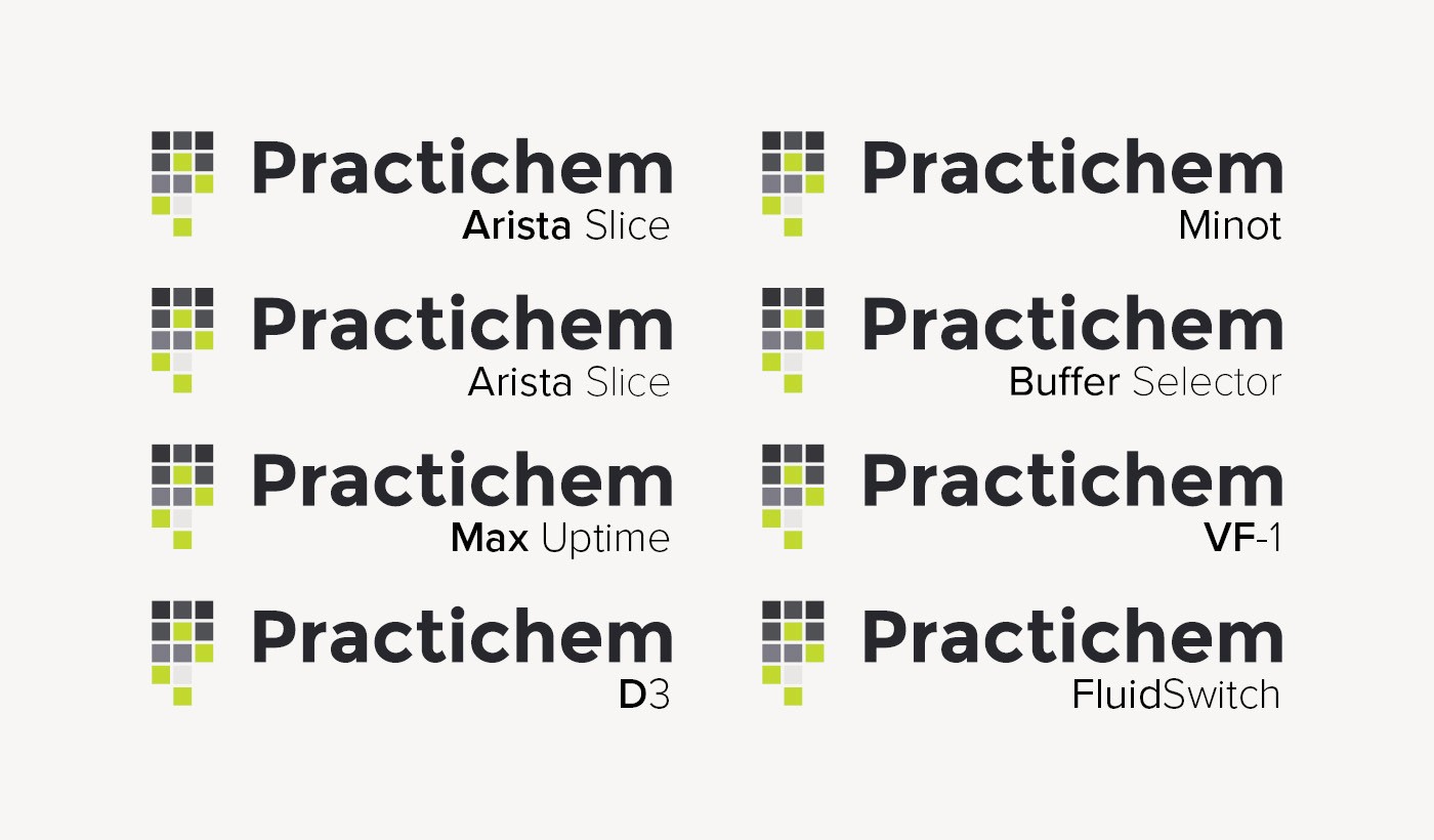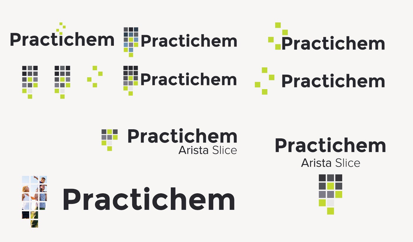 The existing Practichem identity relied on a grid of squares of different shades as a pattern that tied the various marketing graphics together, but the logo itself was completely unrelated and did not communicate anything about the mission of the company at all. I started by exploring how to communicate the process of chromatography through the use of the grid of squares, and continued explorations from there.