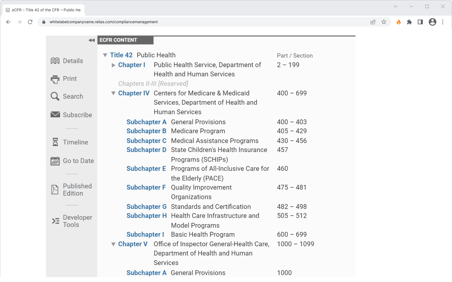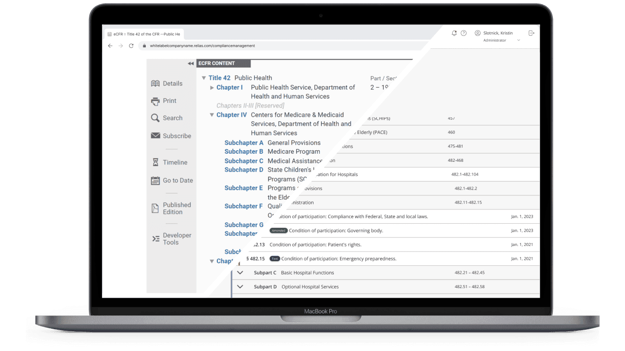 Title 42 is one of the most important federal codes that applies to healthcare and public health in general. Currently, the best way to view the regulations is through the National Archives's eCFR system.