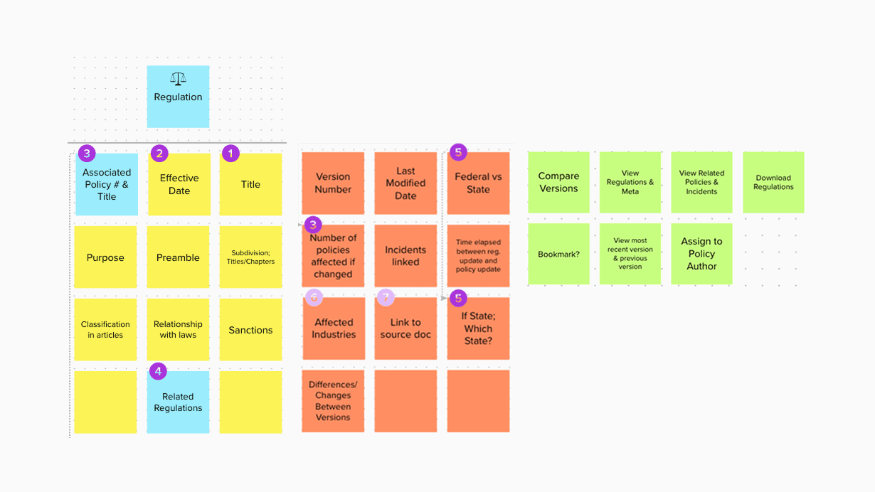 When first learning the problem space for this project, I jumped quickly into working with the object model for our features. Below, I show the grid of stickies that represent the primary object (the Regulation), the various attributes with a few tagged as highest priority, all of the metadata with some tagged by priority, and the CTAs connected to the object.